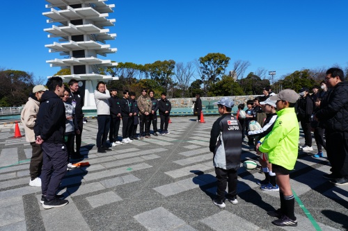 体験では、子どもたちはできるだけ声を使わず、コーチの手の合図を見て、ボールを使ったトレーニングに挑戦しました。普段とは異なる方法で仲間とコミュニケーションすることで相手の動きをよく見て理解し合うことの大切さを体験しました。