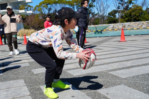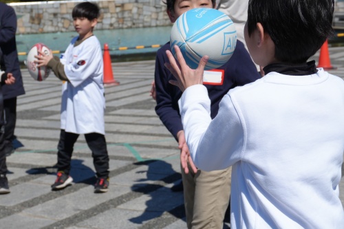 プログラムでは、まずは、ボールの持ち方や扱い方など、ラグビーボールならではの特徴を知ることからスタートしました。
