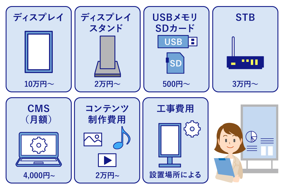 デジタルサイネージを導入するには、ディスプレイやSTBなどの購入および設置と、コンテンツ制作が必要です。運用中にはコンテンツの更新費用やインターネット回線の利用料などもかかります。